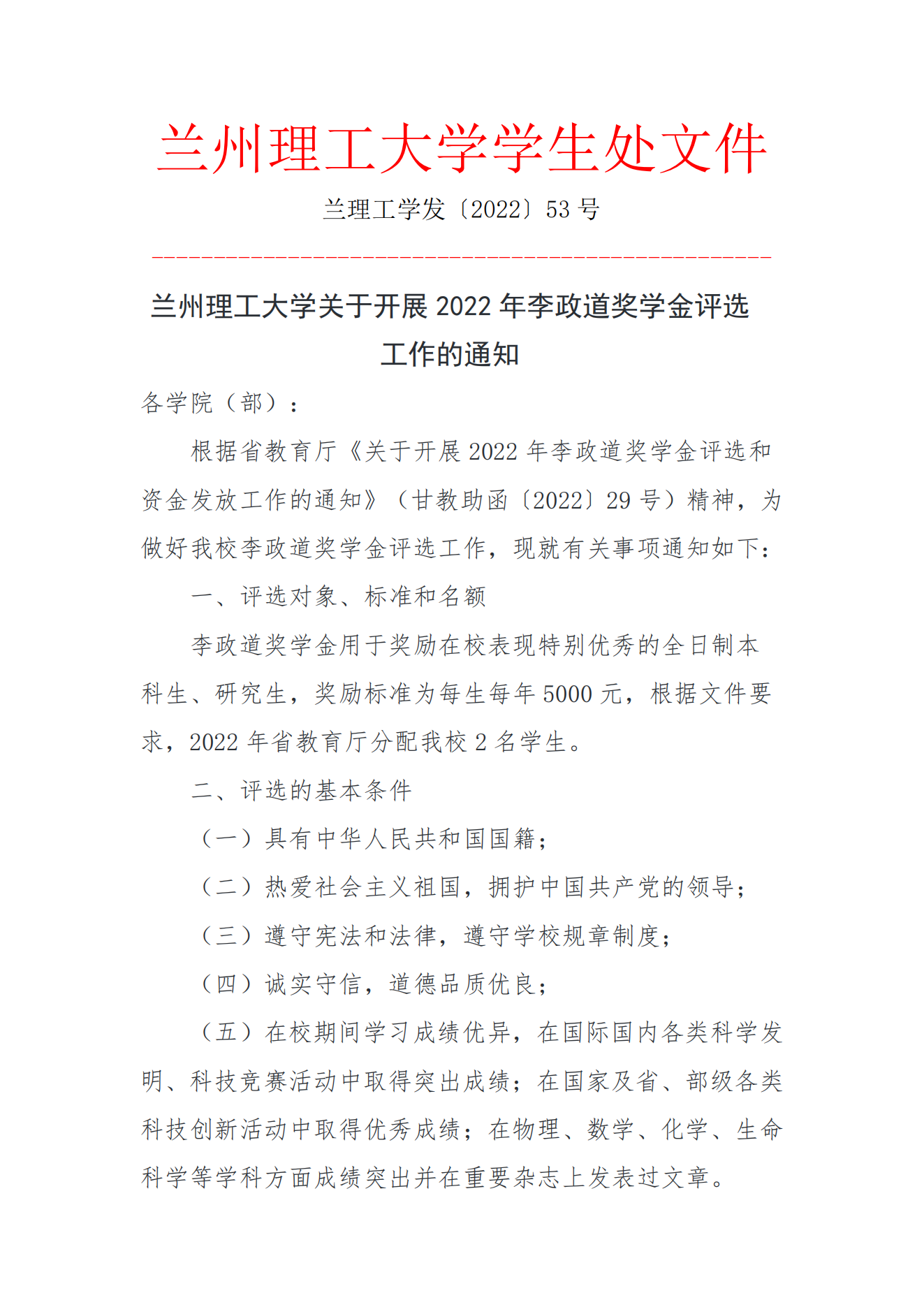 兰州理工大学关于开展2022年李政道奖学金评选工作的通知