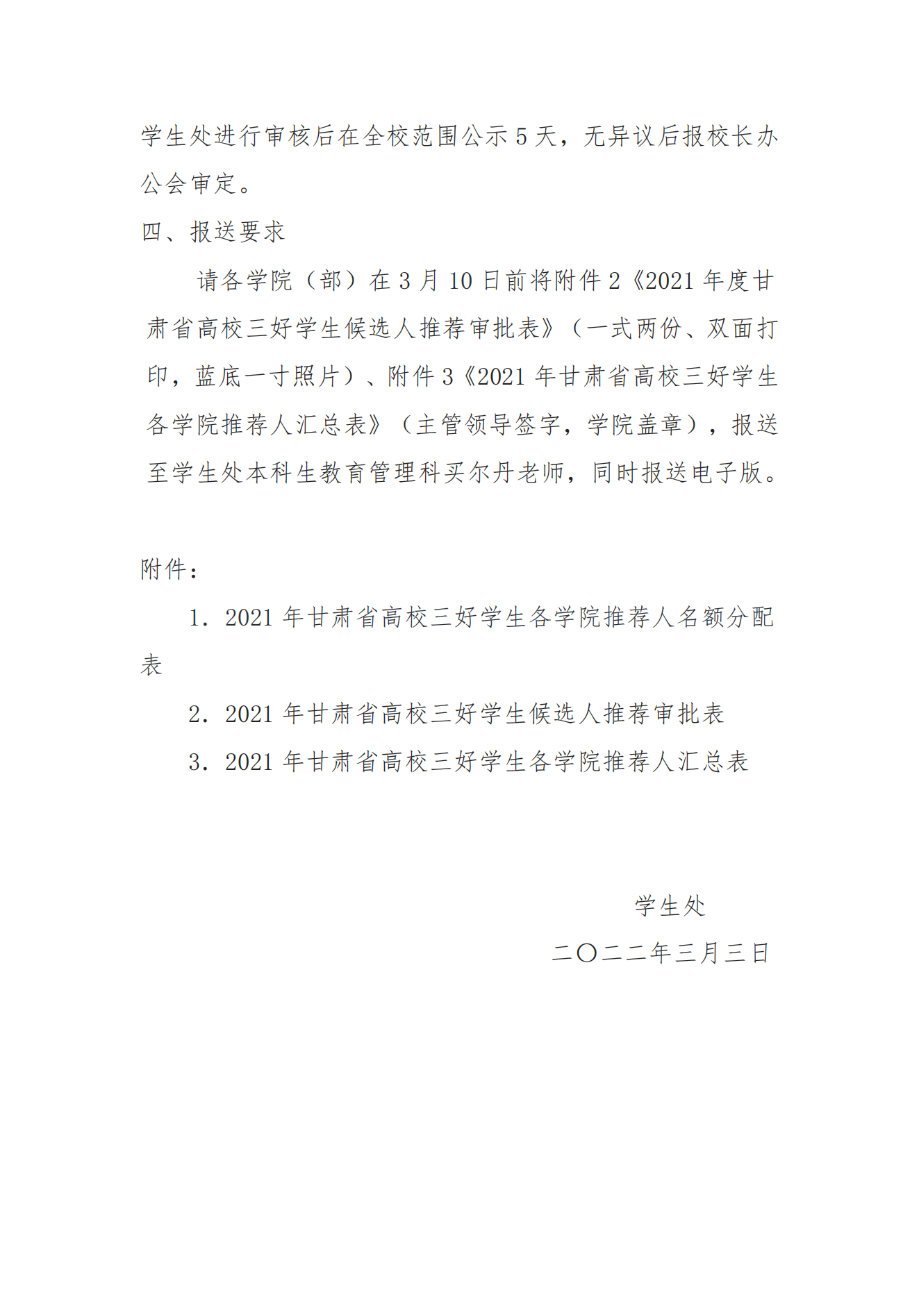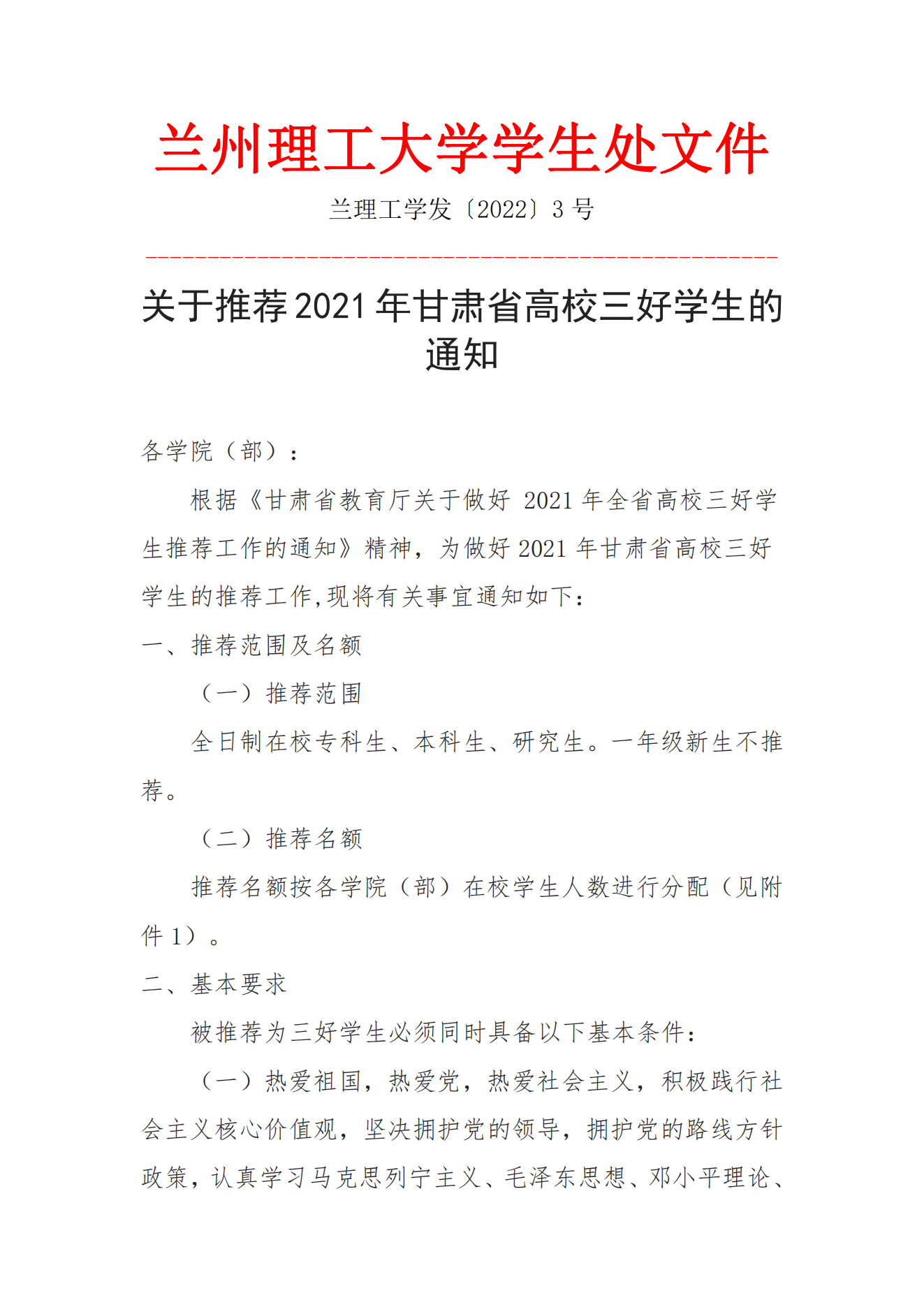关于推荐2021年甘肃省高校三好学生的通知