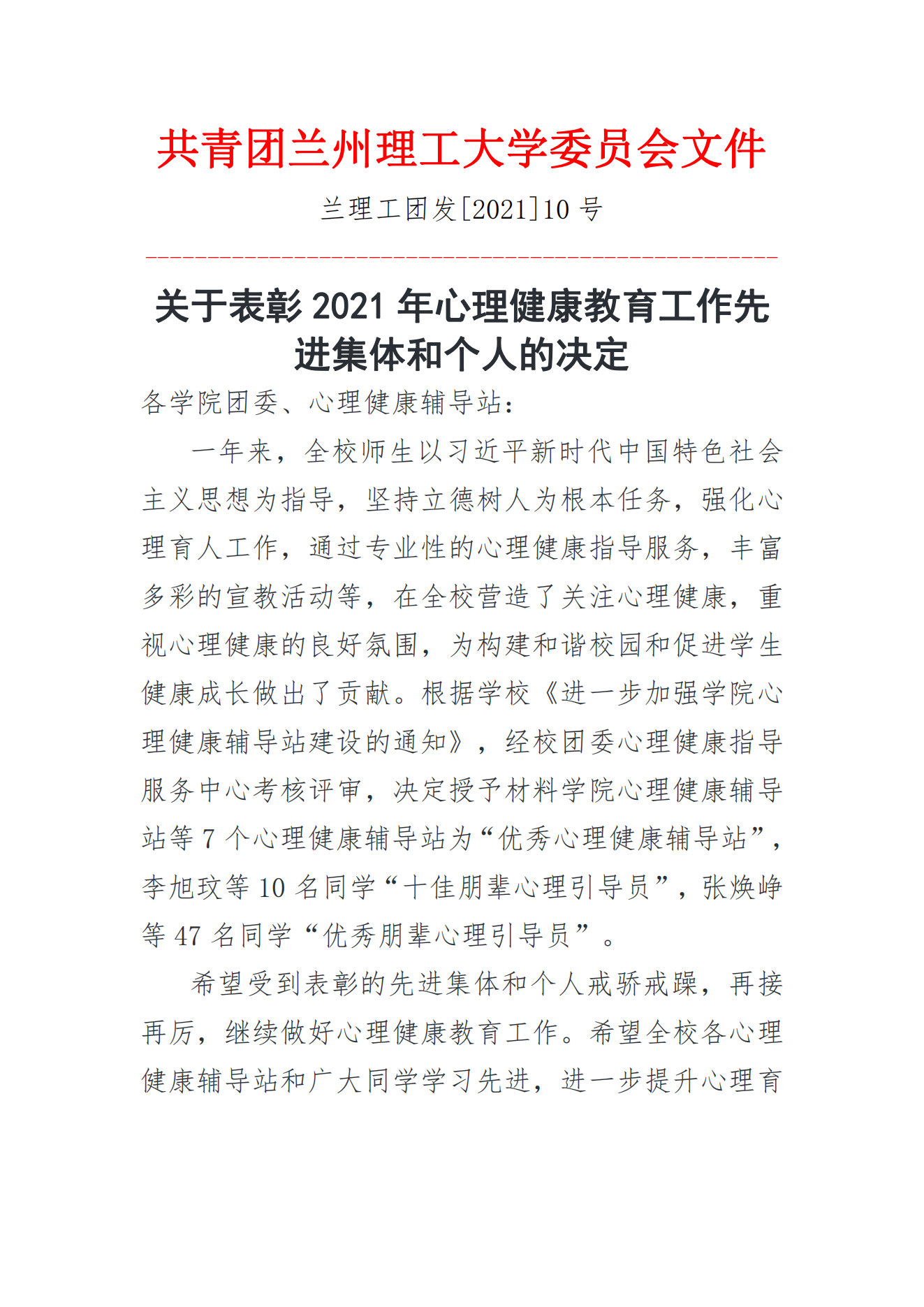 关于表彰2021年心理健康教育工作先进集体和个人的决定