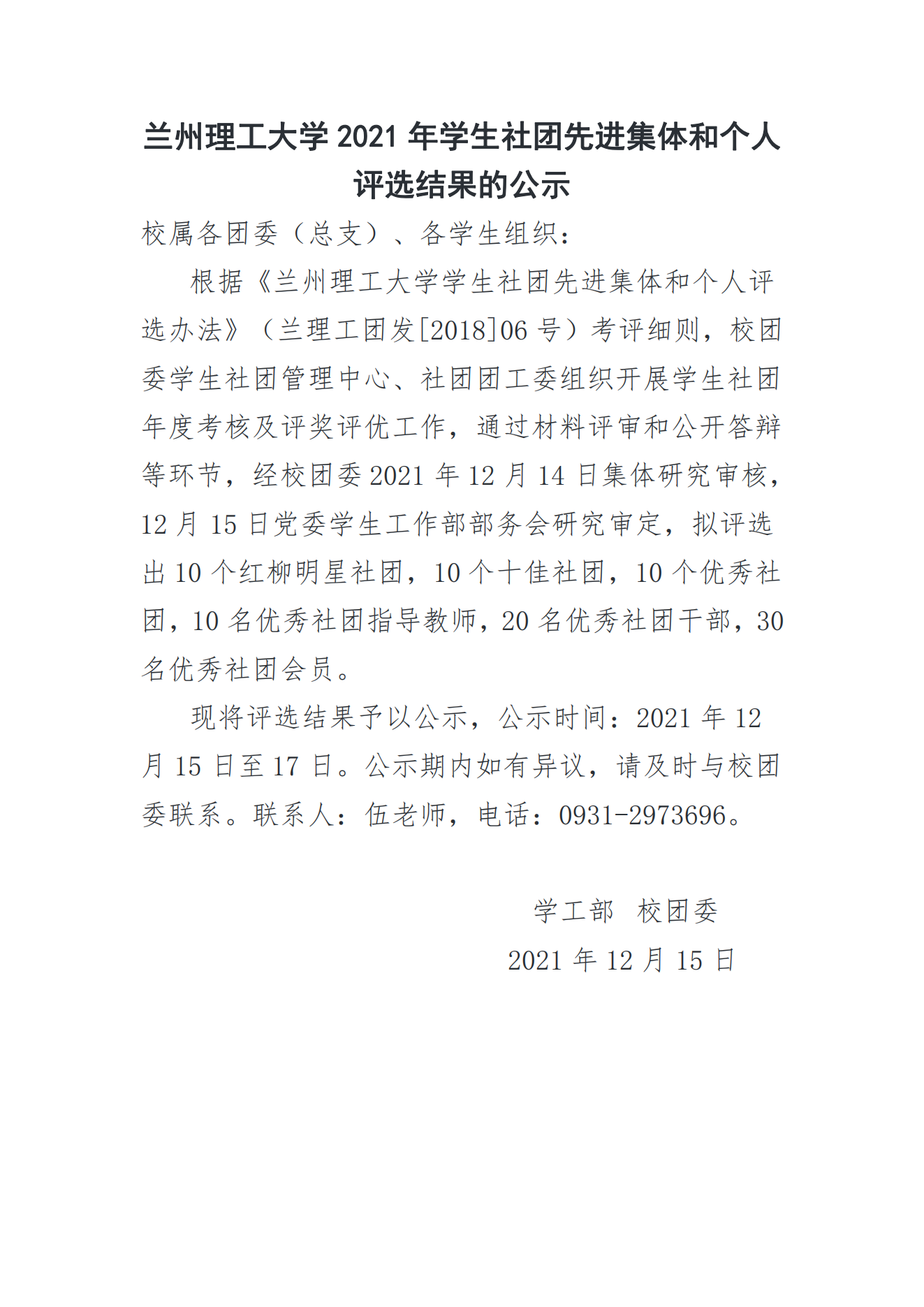 兰州理工大学2021年学生社团先进集体和个人评选结果的公示