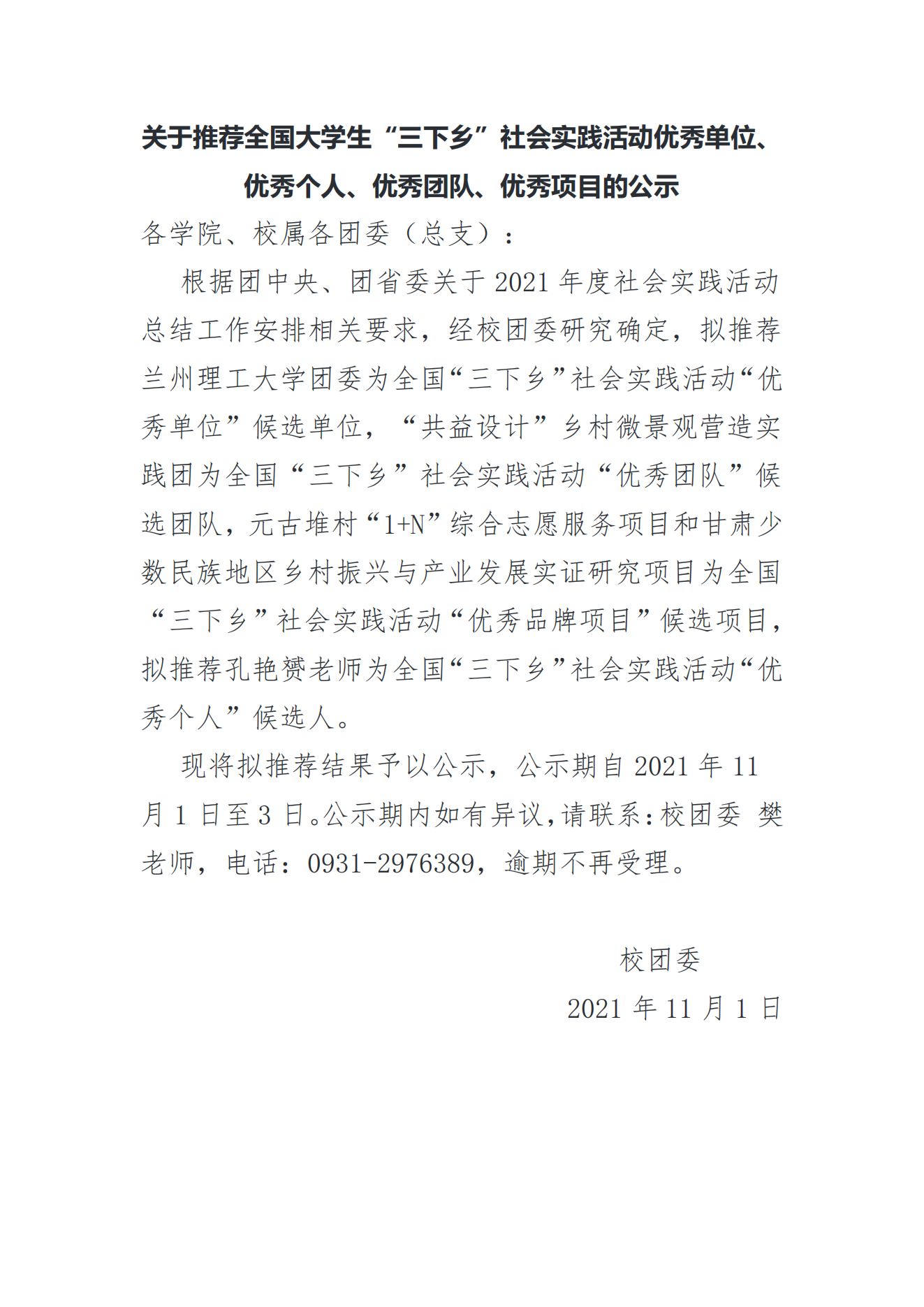 关于推荐全国大学生“三下乡”社会实践活动优秀单位、优秀个人、优秀团队、优秀项目的公示