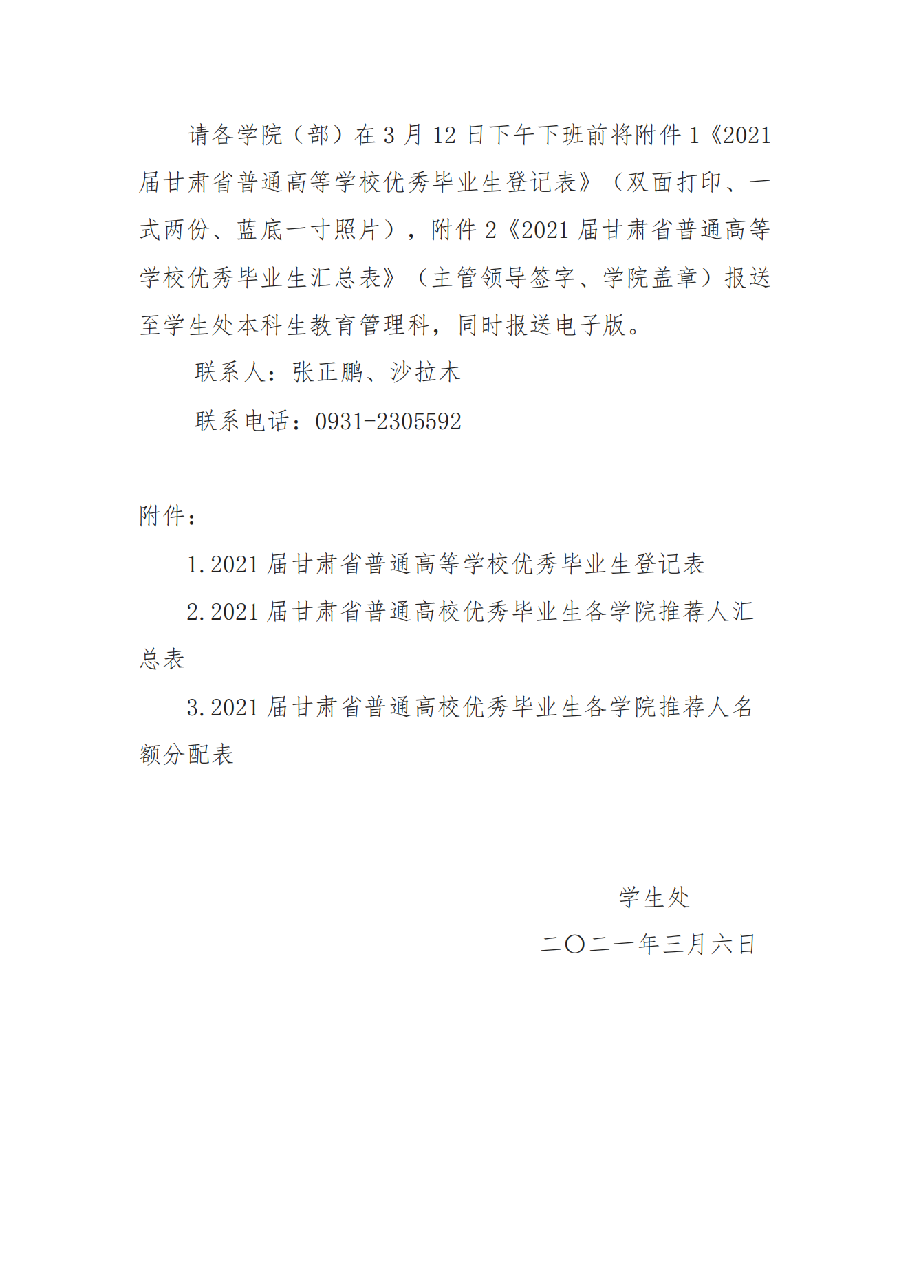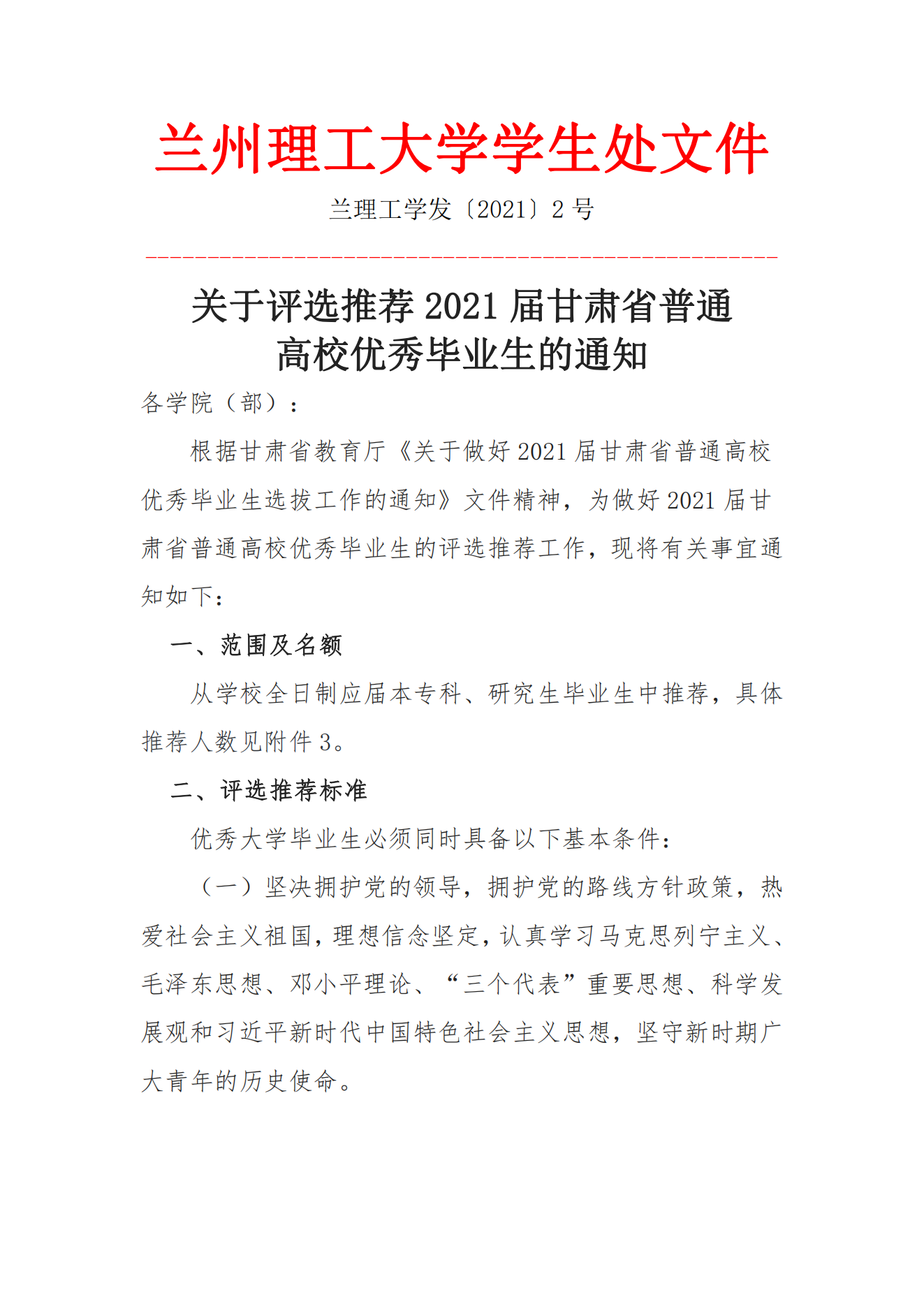 关于评选推荐2021届甘肃省普通高校优秀毕业生的通知